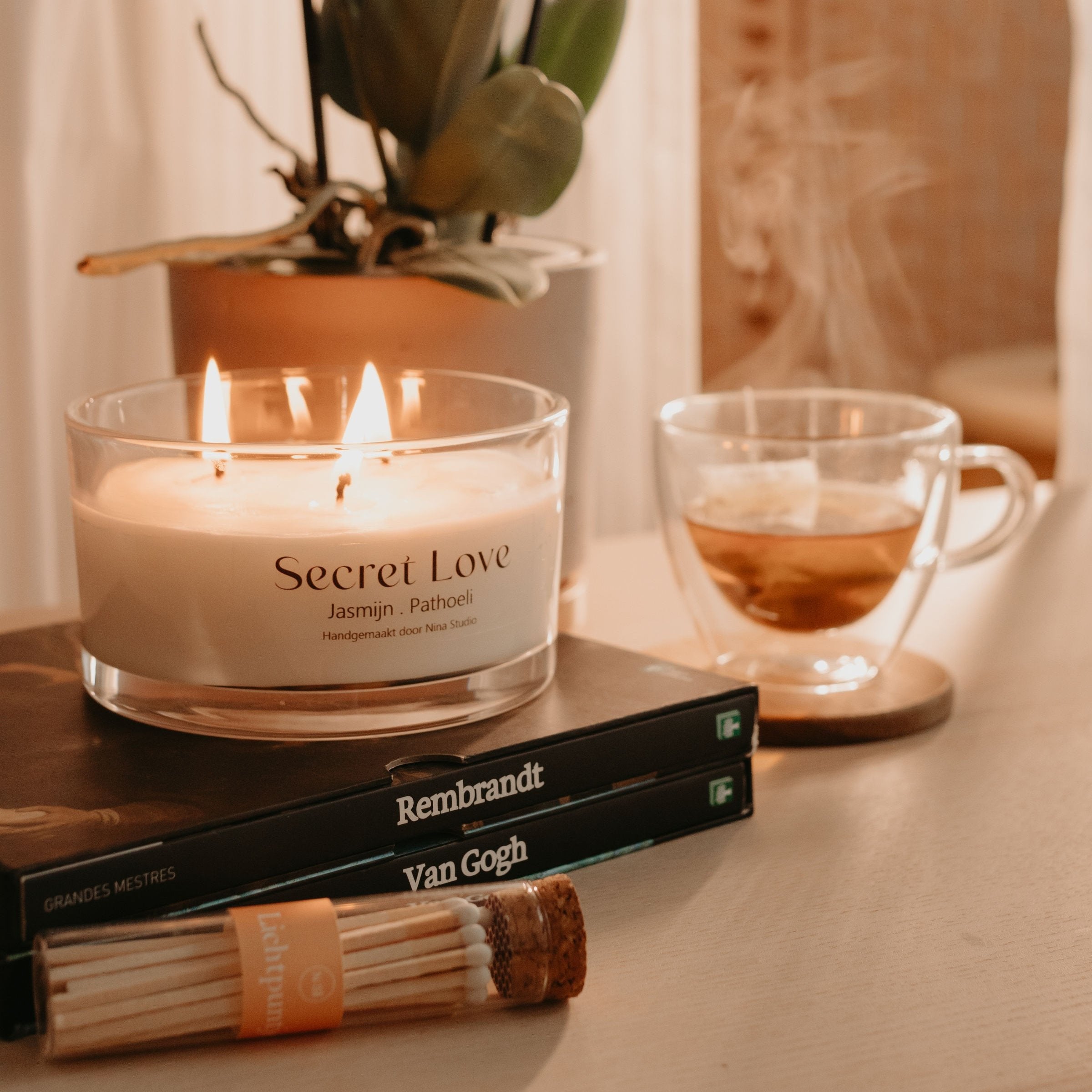 Ontdek de magie van de liefde met onze "Secret Love" geurkaars voor Valentijnsdag. Laat u omhullen door het delicate aroma van jasmijn en patchouli, waardoor een romantische en intieme sfeer ontstaat. Geef speciale momenten cadeau met deze premium kaars, de perfecte essentie om "Vier de liefde.
